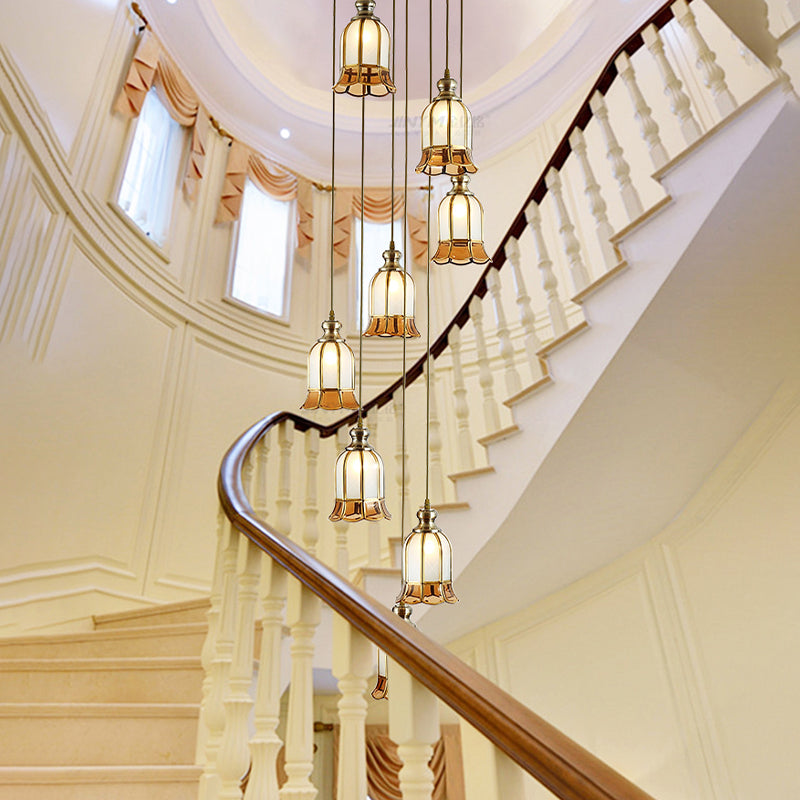 Suspension florale en verre de lait colonial avec 8 ampoules en laiton
