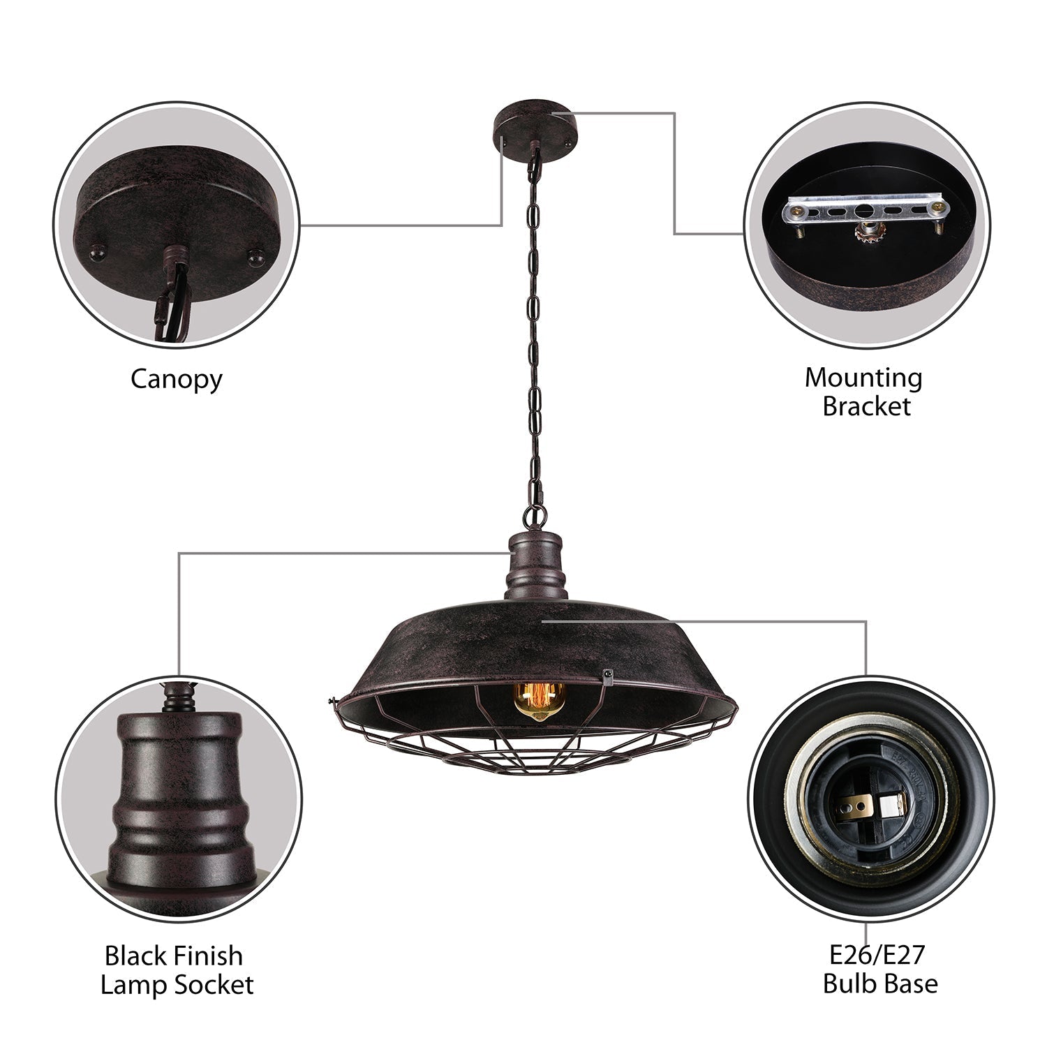 Ce produit est un plafonnier conçu pour un look industriel. Il est fabriqué en métal avec une finition en bronze. La lampe est de style grange et est suspendue à un cadre en fil de fer. La longueur de la lampe est réglable. La lampe n'est pas incluse, mais la tension est de 110 V-120 V. Le type de lampe peut être LED, à incandescence ou fluorescent.