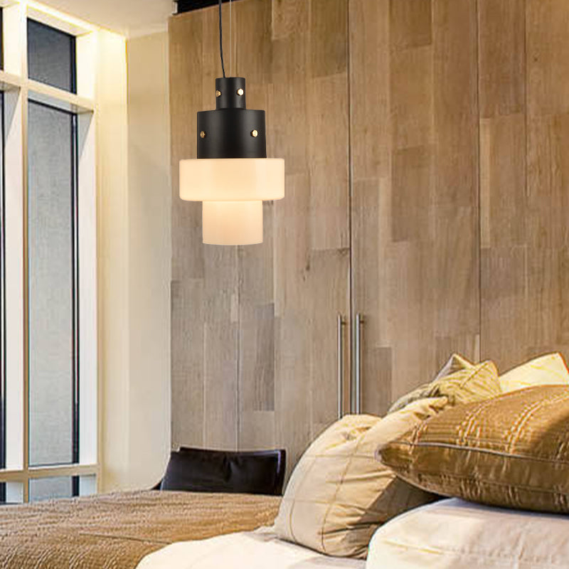 Rustic White Glass Cylinder Pendant Light For Living Room - Single Head Black Ceiling Fixture