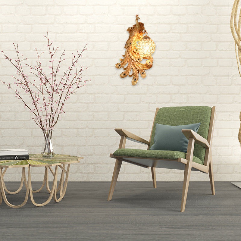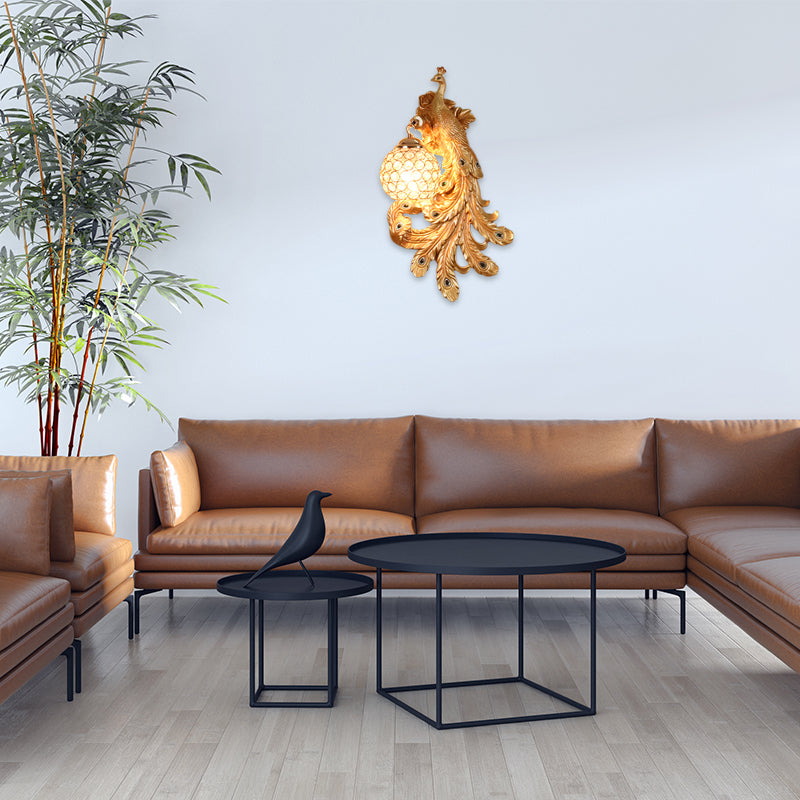 Blue/Gold Peacock Wall Lamp - Country Resin Sconce Lighting With Crystal Globe Shade (1/2-Pack) Gold