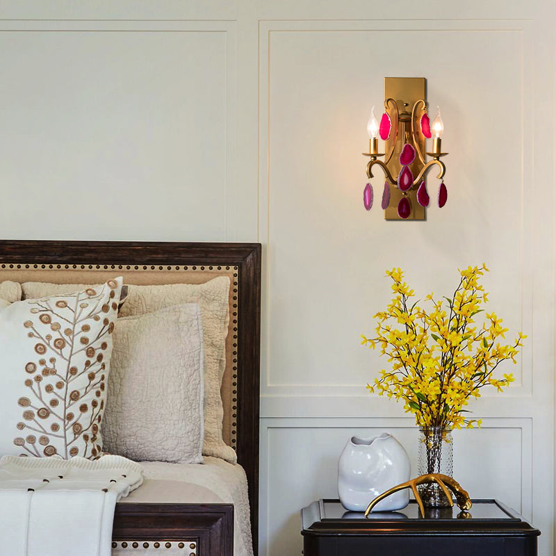 Cette applique est en métal et cristal. Il est dans un style vintage et est violet foncé et clair. Il a deux têtes lumineuses et une ampoule ouverte. Il y a une plaque arrière rectangulaire. Il doit être câblé directement dans l'électricité. Il mesure de 15 à 19 pouces de haut et 11 pouces de large. L'ampoule n'est pas incluse. Le culot de l'ampoule est E12/E14.