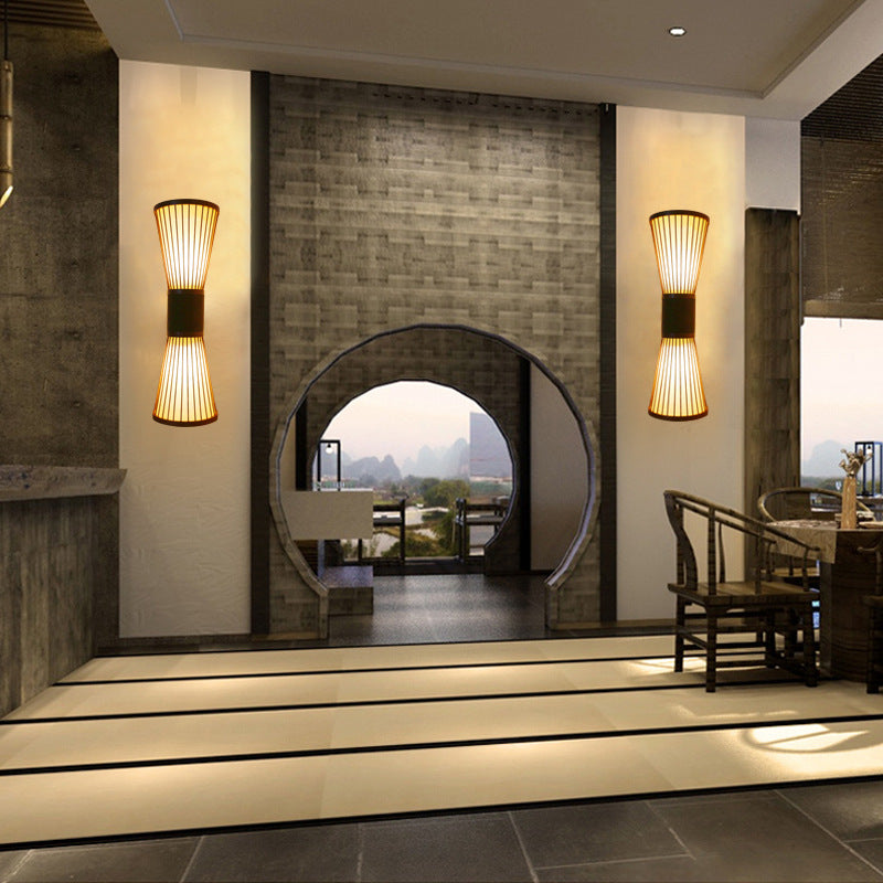 Applique murale sablier en bambou - Luminaire mural moderne avec 2 ampoules en bronze pour salon