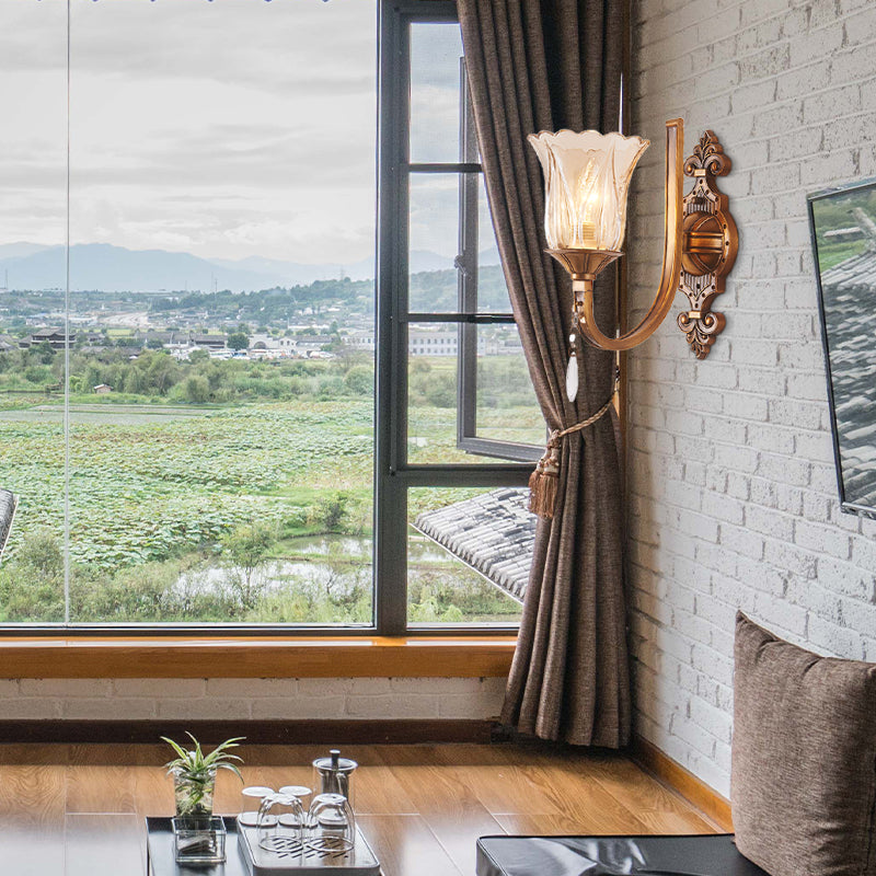 Vintage Cognac Glass Flower Wall Light With Brass Sconce Crystal Drop - 1/2 Heads 1 /