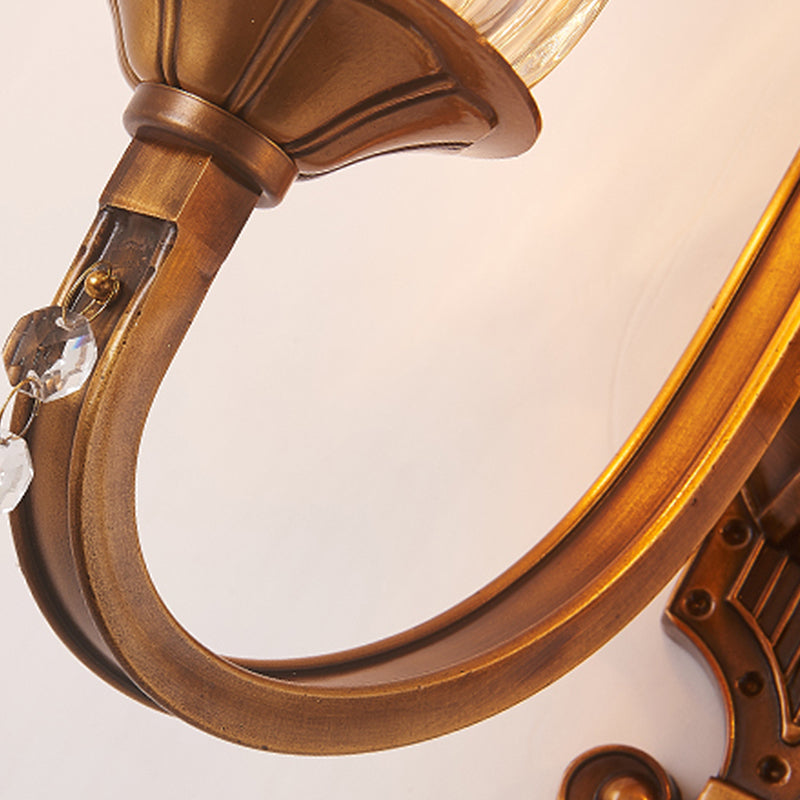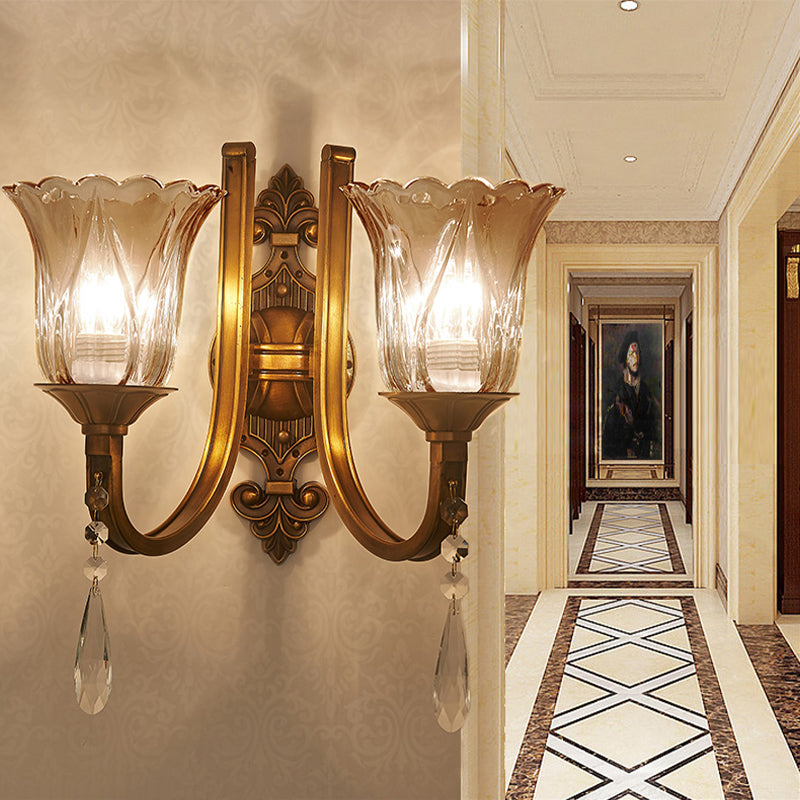 Vintage Cognac Glass Flower Wall Light With Brass Sconce Crystal Drop - 1/2 Heads 2 /