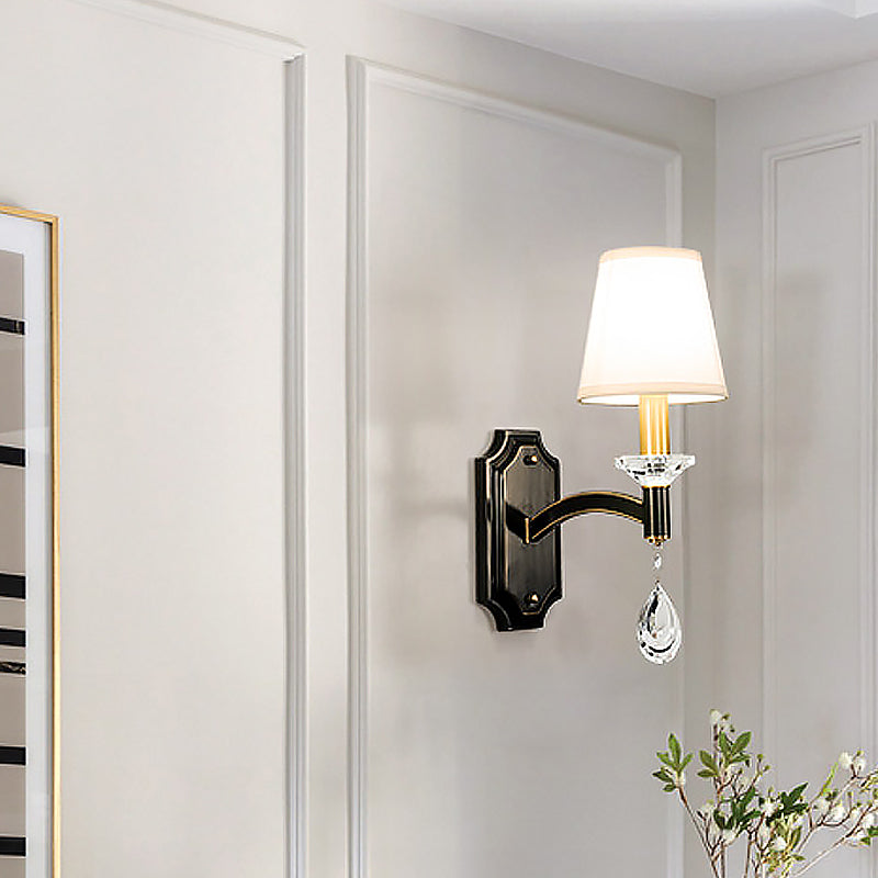 Vintage Cut Crystal Teardrop Wall Mount Light: Brown Lamp Fixture With Conic Fabric Shade