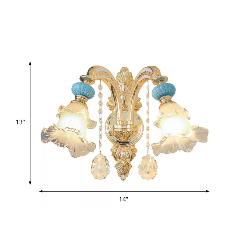Applique Murale Nordique Fleur en Verre Blanc avec Goutte de Cristal - Accent Doré, Idéal pour Chambre à Coucher - 1/2 Lumières