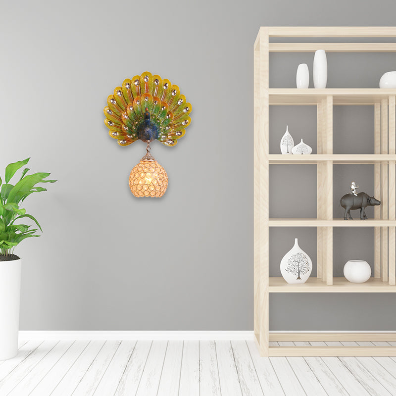 Retro Stylish Wall Sconce With Clear Crystal And Peacock Backplate In Silver/White