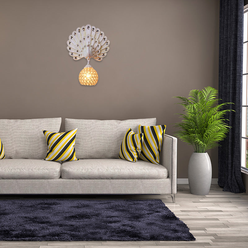 Retro Stylish Wall Sconce With Clear Crystal And Peacock Backplate In Silver/White White
