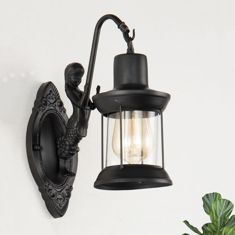 Applique murale en verre transparent avec décoration sirène - Lanterne noire industrielle pour éclairage extérieur