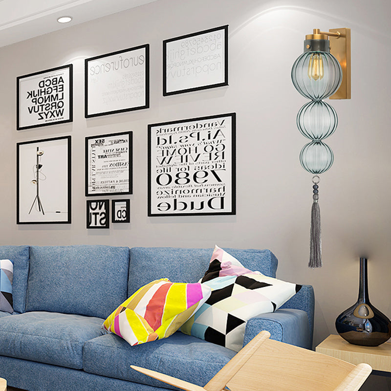 Applique murale en laiton/chrome de style chinois - Lampe murale en verre transparent/ambre/bleu clair avec nœud à pompon