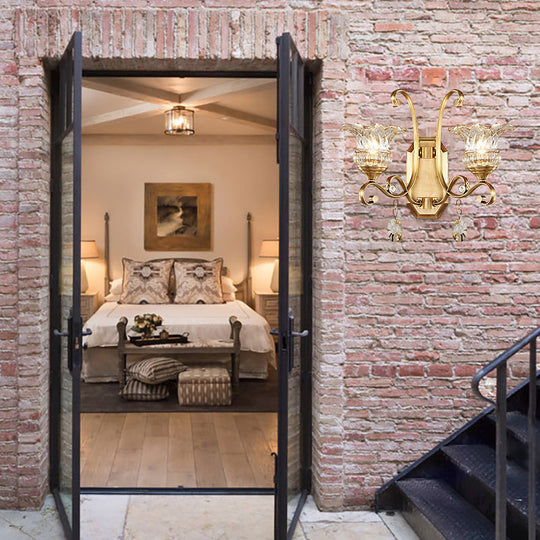 Modern Clear Glass Flower Sconce: Brass Wall Lamp With Crystal Accent - 1/2 Lights 2 /