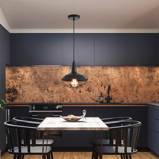 Farmhouse-Style Hanging Pendant Lamp With Tapered Cage In Barn-Shaped Black Metal
