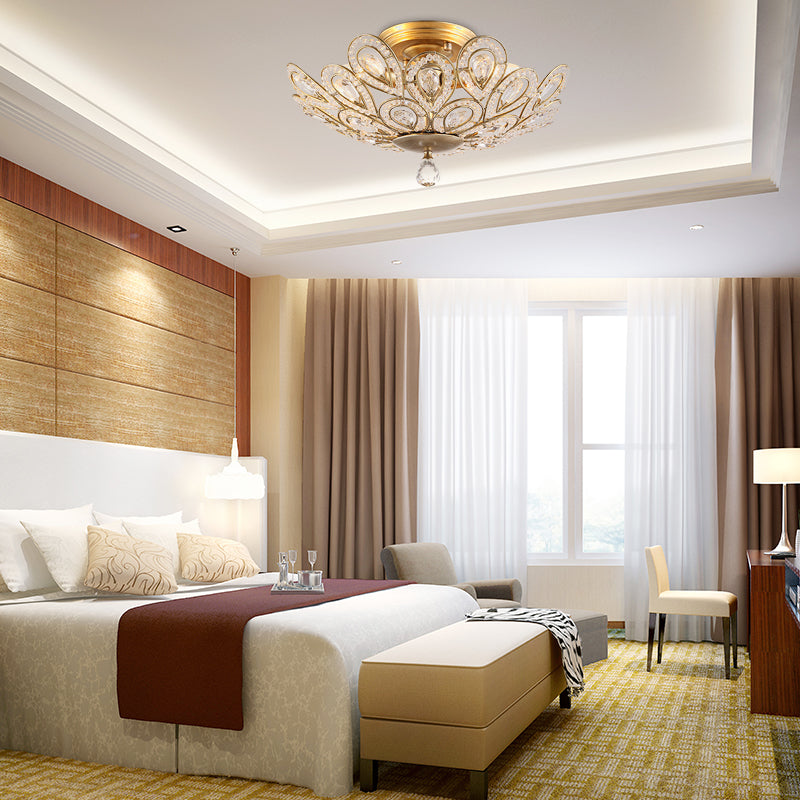 Brass Peacock Tail Flush Ceiling Light - Lodge Style Metal Lamp With Crystal Beads 3/5 Lights For