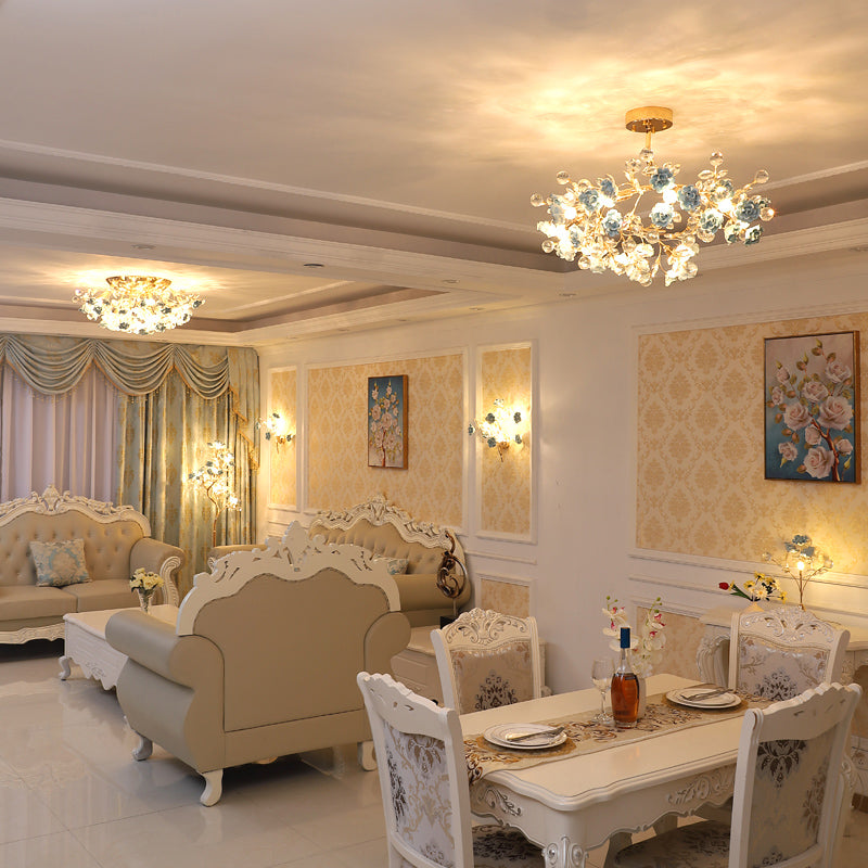 Pastoral Rosebush Ceiling Light: Ceramic Semi Flush Fixture With Crystal Accents 10 / Blue
