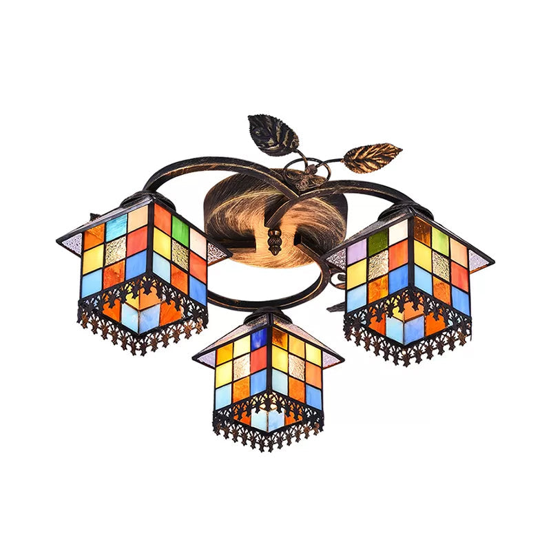 Antique Brass Stained Glass Ceiling Light - Cube Semi Flush Mount With Leaf Decoration Tiffany