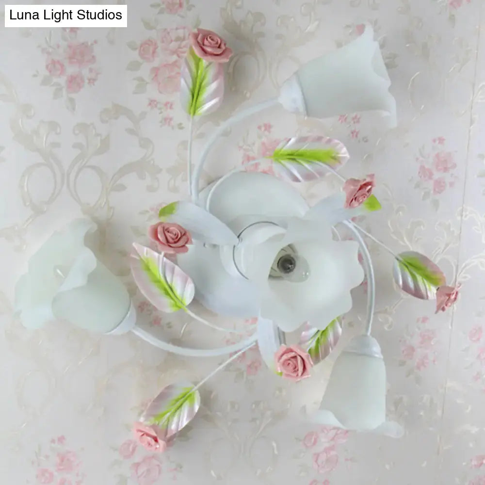 American Garden Swirl Living Room Semi Flush Light - Metal 4/7-Head White Lamp With Frosted Glass