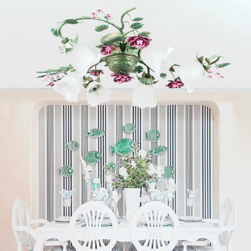 Turquoise Finish Country Flower Opaline Glass Ceiling Light - Semi Flush Mount 6 /