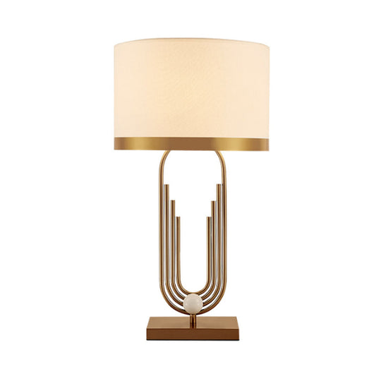 Lampe de Bureau Vintage Ovale Cannelée en Métal avec Finition Dorée et Abat-Jour en Tissu