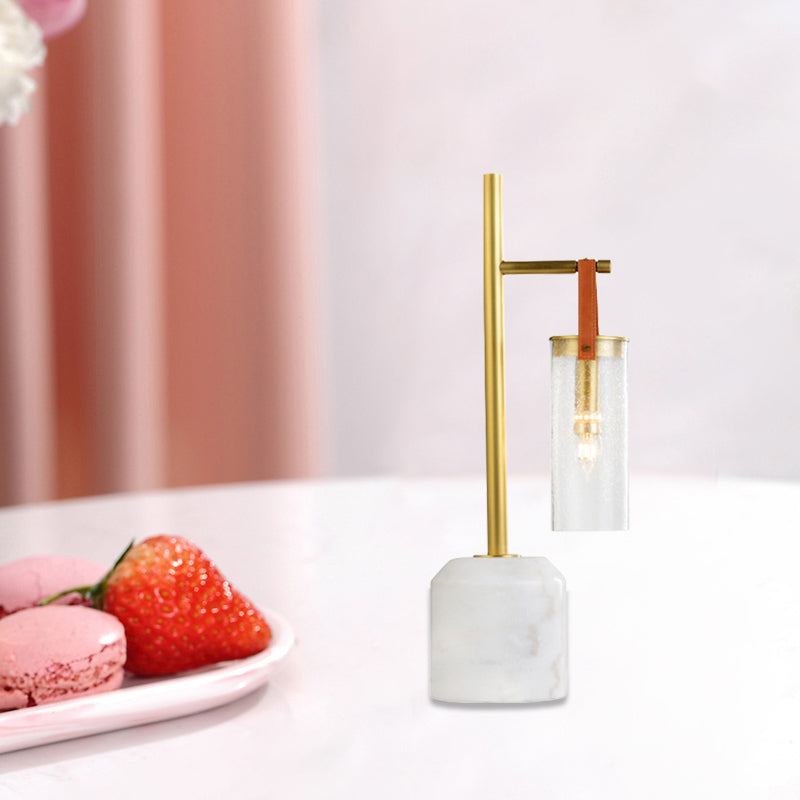 Lampe de table Mid Century Tube Seedy en verre avec bracelet en cuir et base en marbre - Finition dorée