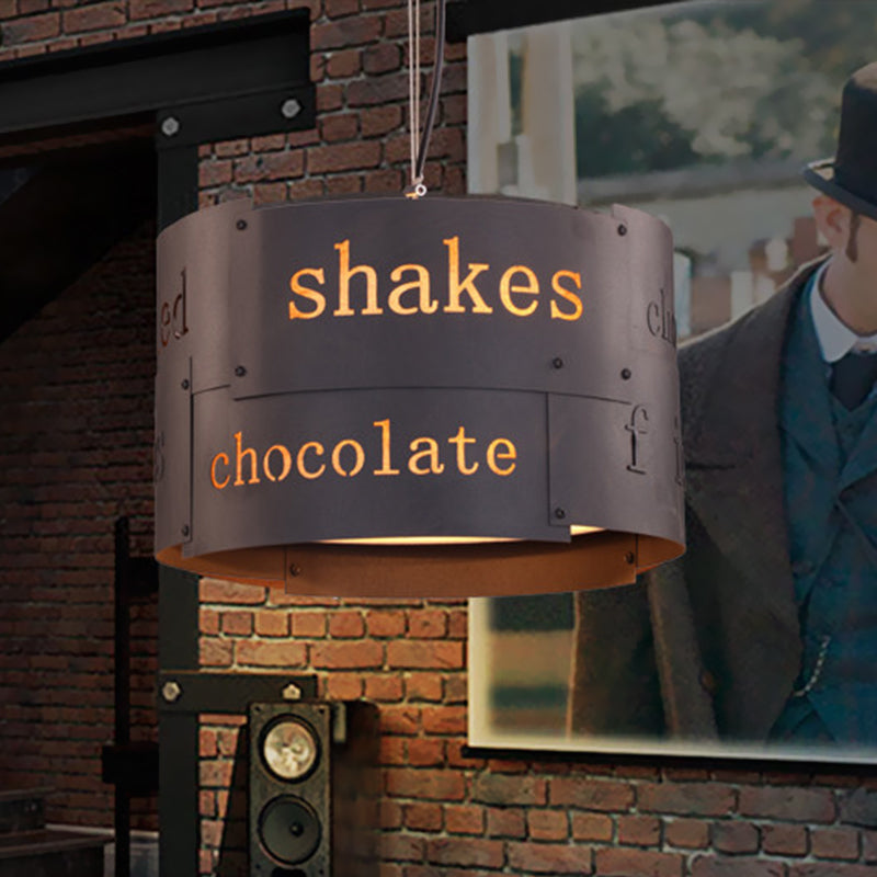 Lustre à tambour en fer noir vieilli avec 3 têtes - Luminaire suspendu au plafond avec motif de lettrage