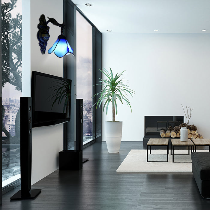 Cette applique murale exquise fait partie de la collection fiable de Tiffany. Il ajoute une touche unique à n'importe quel espace intérieur, en veillant à ce que votre espace intérieur se démarque des autres. Parfaitement adaptée à une ambiance cosy et intimiste, cette applique affiche un étonnant motif de nuances de pétales dans des teintes de Clair/Rose/Bleu Clair/Bleu Foncé/Beige. Montée sur un corps en laiton vieilli magnifiquement fini, le look de cette lampe est vraiment remarquable. Il dispose d'une source de lumière pour une douce lueur dans toute la pièce, parfaite pour éclairer les salons, les chambres, les salles à manger, etc.