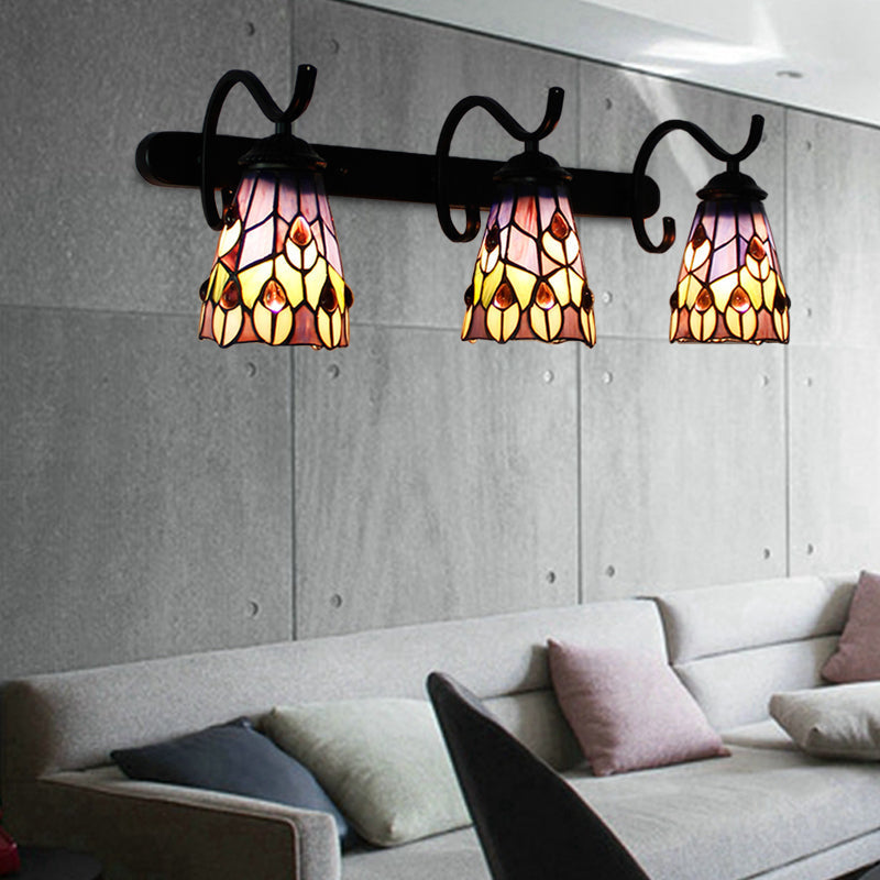 Tiffany Stained Glass Cone Sconce Wall Light With Peacock And Flower Design Black /