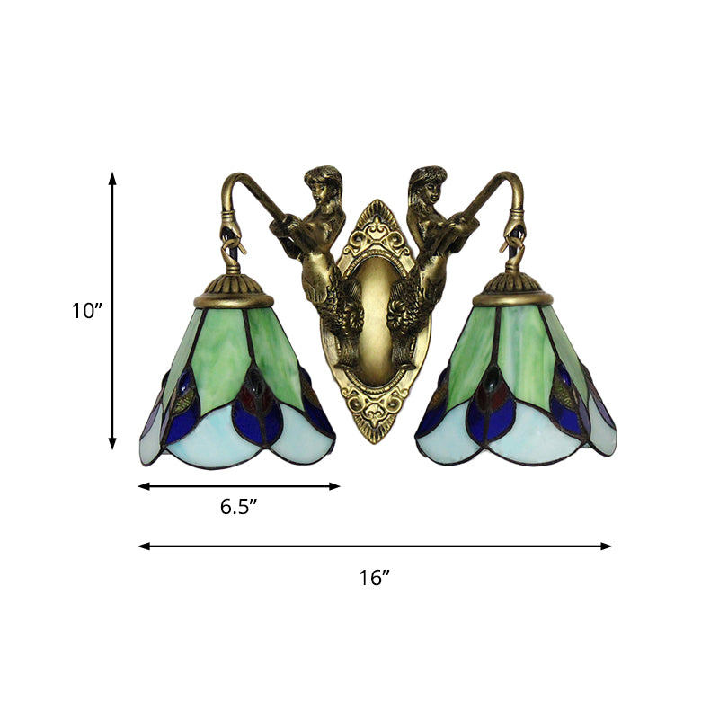 Applique murale en verre vert Tiffany avec décoration de sirène - jaune, montage mural, 2 têtes