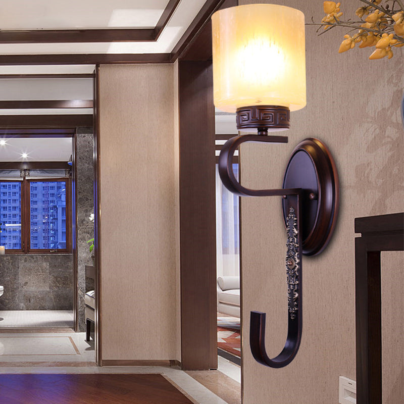 Cette applique murale présente un design traditionnel avec une finition noire et un abat-jour en verre ambré. L'ampoule n'est pas incluse. La lampe murale est en métal et mesure 7,5" de large et 20,5" de haut. Il est évalué pour 220V-240V ou 110V-120V.