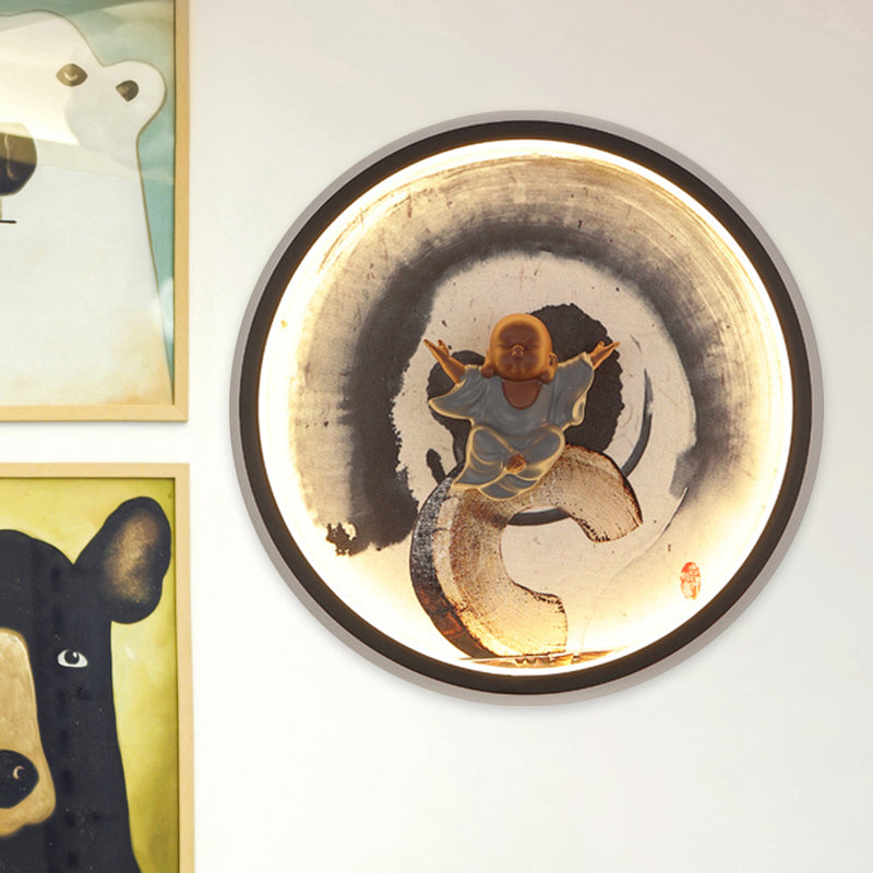 Led Asian Buddha Boy Mural Lamp: Wall Mounted Aluminum Lighting With Black Halo Ring - Ideal For