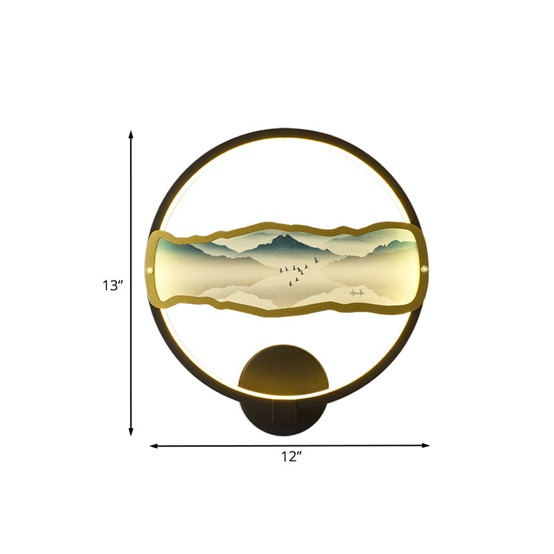 Applique murale LED à motifs de montagne de style asiatique - Noir et circulaire avec lumière chaude/blanche