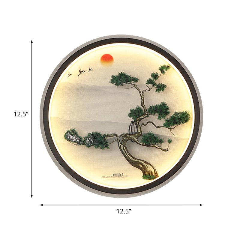 Applique murale LED asiatique moderne en métal avec peinture murale en pin vert et cadre rond noir