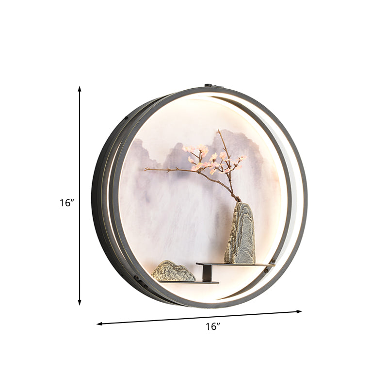 Black Oriental Metal Wall Mounted Led Light With Mountain And Flower Pattern