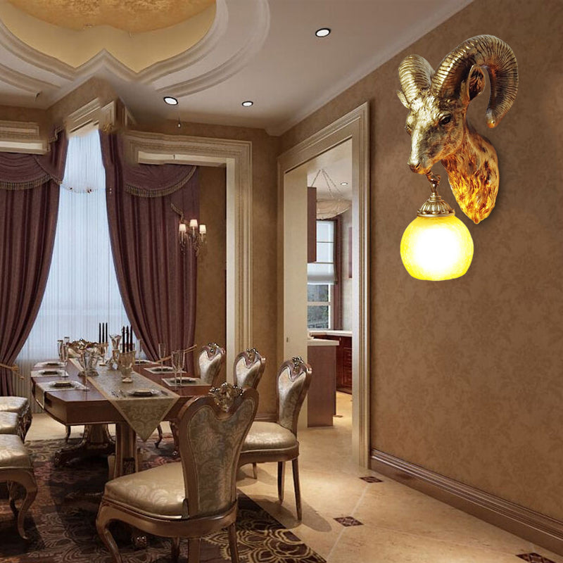 Country Style Goat Resin Gold Sconce Lamp - 1-Light Wall Mounted Lighting With Crystal/Glass Shade