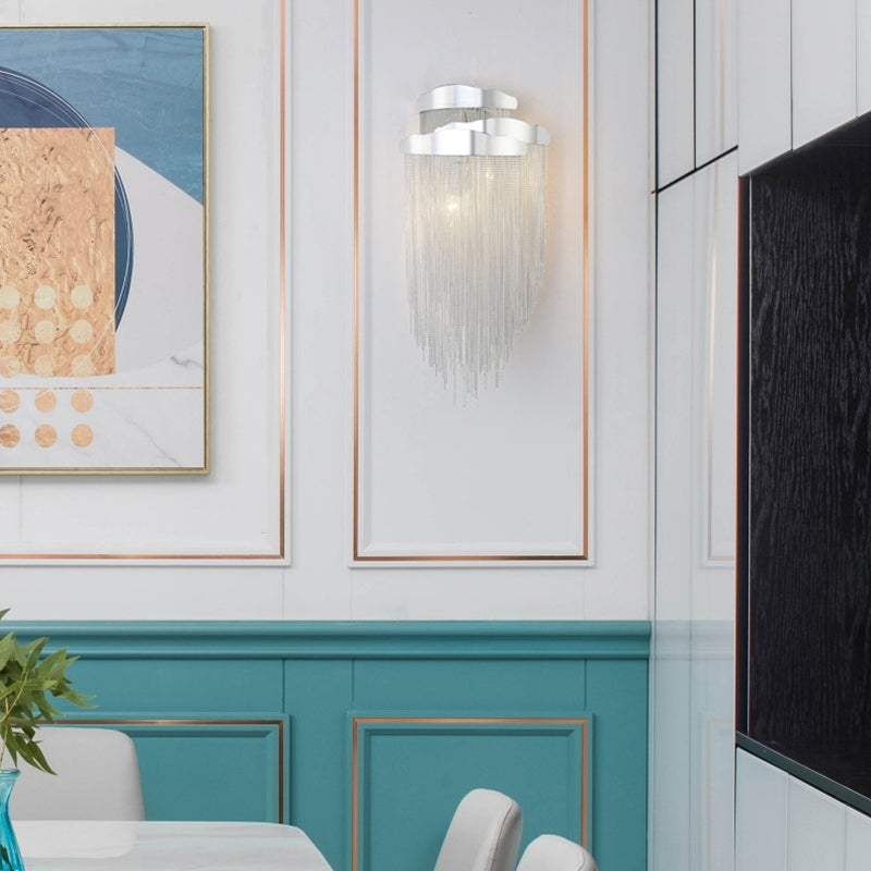 Modern Silver Metal Chain Wall Light Fixture With 3 Sconce Lights For Bedroom