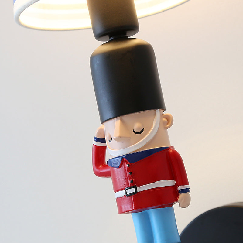 Cette applique murale est parfaite pour une chambre d'enfant. Il a la forme d'un soldat et l'abat-jour en tissu a la forme d'un chapeau fuselé. La lumière est disponible en blanc ou noir et la base est E12/E14. Il mesure 11" de haut.