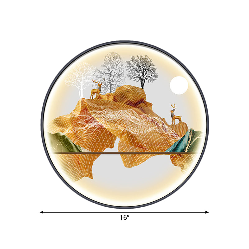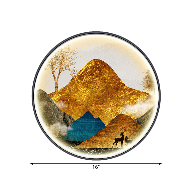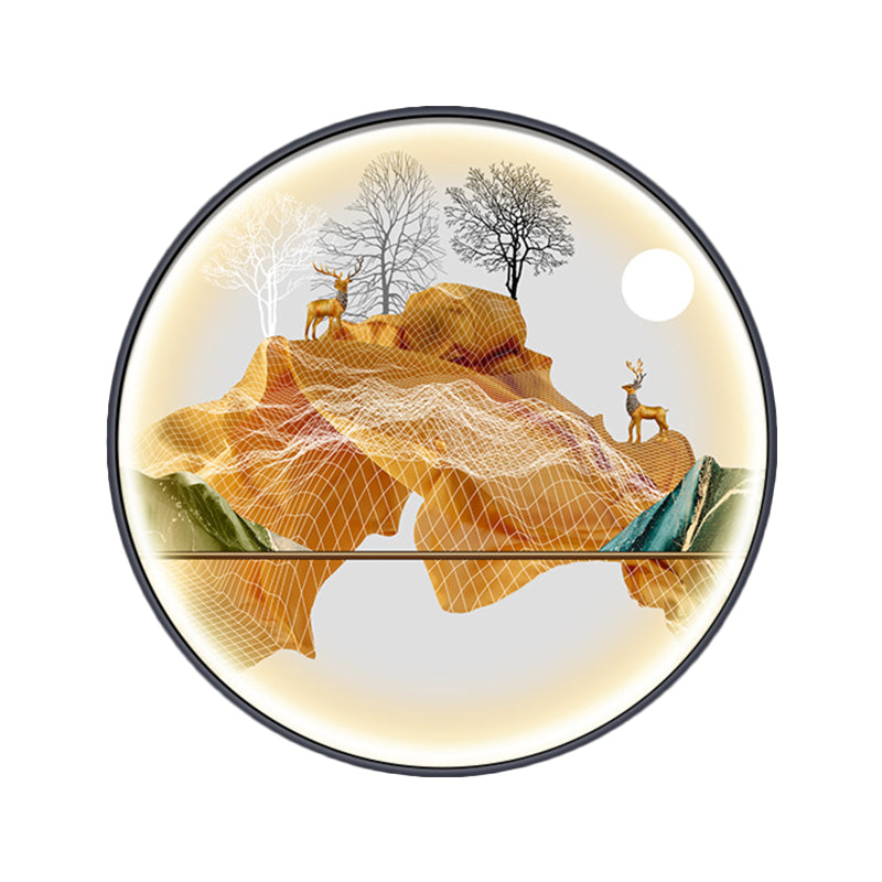Asian-Style Led Fabric Wall Mural Mount Lamp - Yellow/Green Circle Light With Landscape Pattern