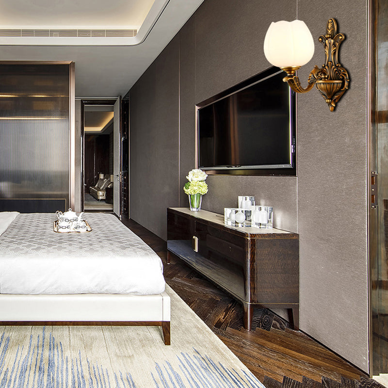 Vintage Antique Brass Wall Sconce With Milky Glass Shade: Stylish 1/2-Light Bowl 1 /