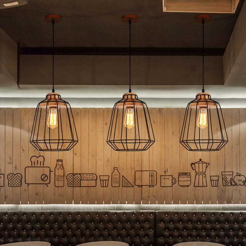 Vintage Black Hanging Pendant Light With Metal Cage Shade For Bedroom - Retro Style Lamp