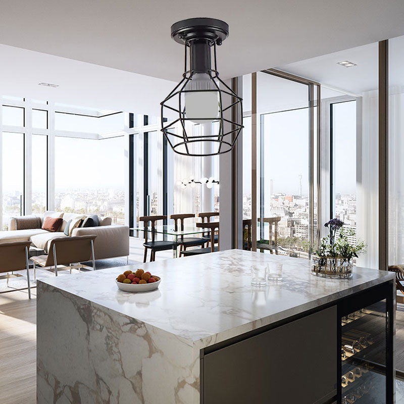 Mini Caged Ceiling Mounted Industrial Black Metal Light Fixture For Corridor