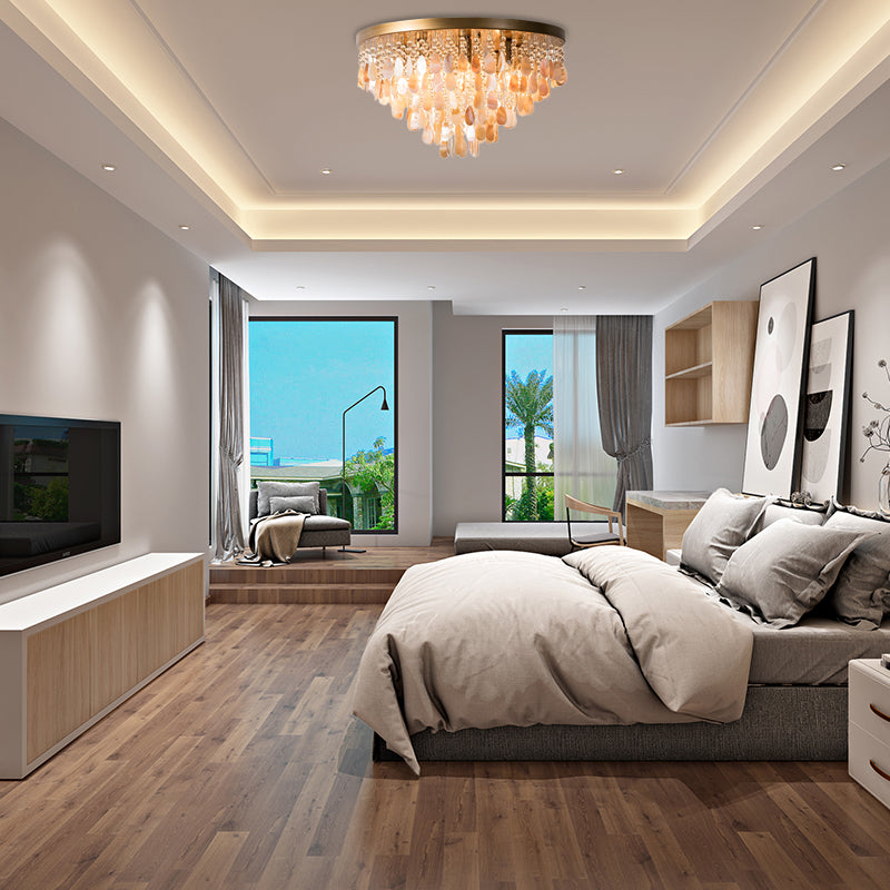 Modern Shell Tiered Flush Mount Light With Crystal Bead - Brass Finish | 6/9 Lights 16’/19.5’ W