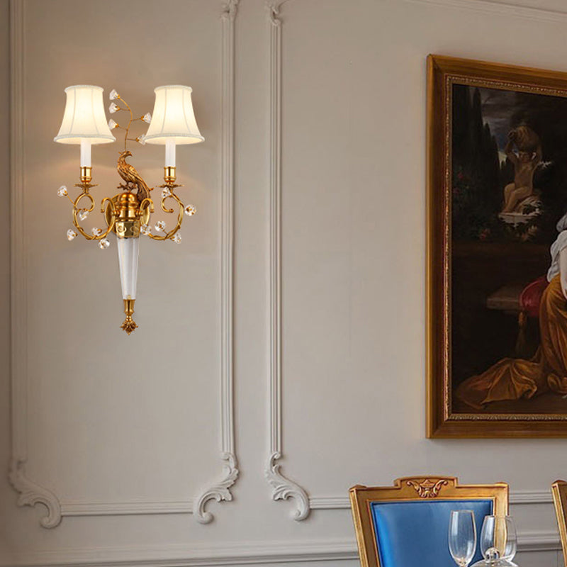 Countryside Brass Fabric Sconce Wall Light For Bedroom With Curved Arm - Set Of 2