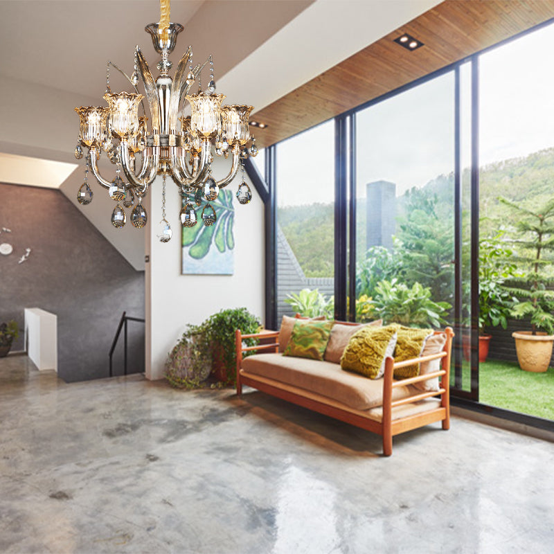Modern Amber Chandelier Light With Floral Glass Shade - 6/8 Bulbs 23.5/27.5 W