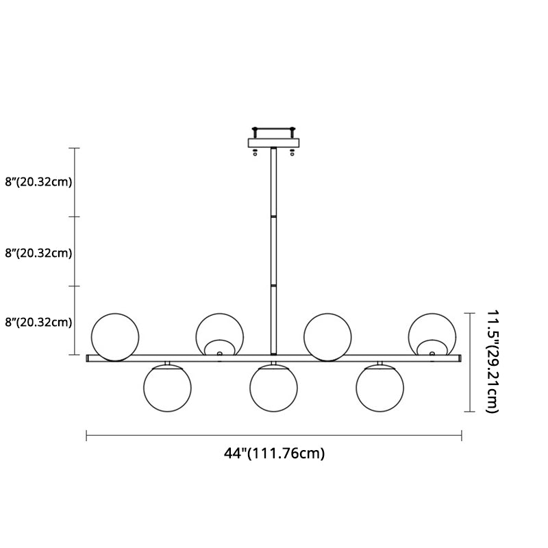 Il s'agit d'un luminaire suspendu moderne en métal doré à 7 ampoules. Il est doté d'un îlot sphérique en verre blanc et est parfait pour une utilisation sur une table à manger. Il nécessite une tension de 220-240 V ou 110-120 V et possède une base E26/E27. Le type d'éclairage peut être LED, incandescent ou fluorescent.