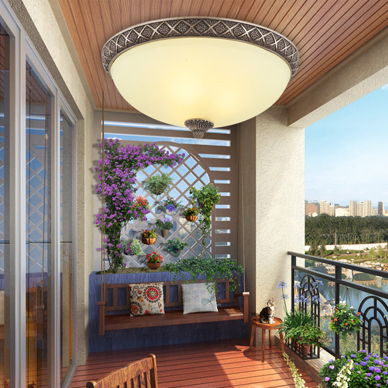 Ce plafonnier est doté d'un bol en verre dépoli et est disponible en marron. Il a un style traditionnel et est disponible en cinq configurations d'éclairage différentes. Le type d'éclairage peut être LED, incandescent ou fluorescent. Ce plafonnier mesure 8,5 pouces de haut et 19 pouces de large.