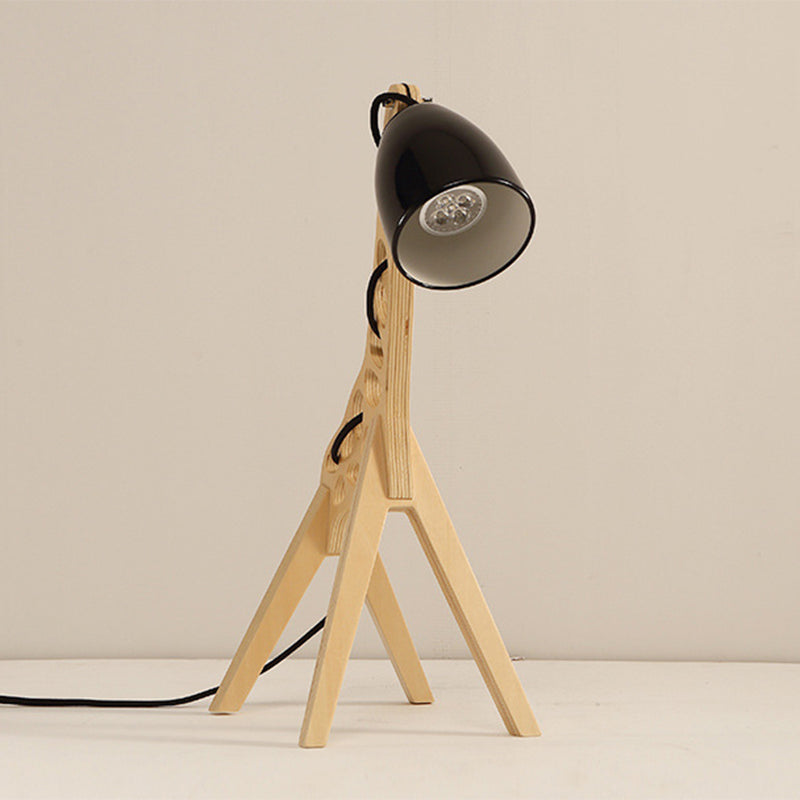 Ce produit est une lampe de table en forme de cloche de dessin animé. La lumière est alimentée par une ampoule LED, incandescente ou fluorescente (non incluse) de 110 V ou 220 V. La lampe a une base en bois en forme de girafe et l'abat-jour est en métal. La lampe est disponible dans les couleurs bleu, rouge ou vert.