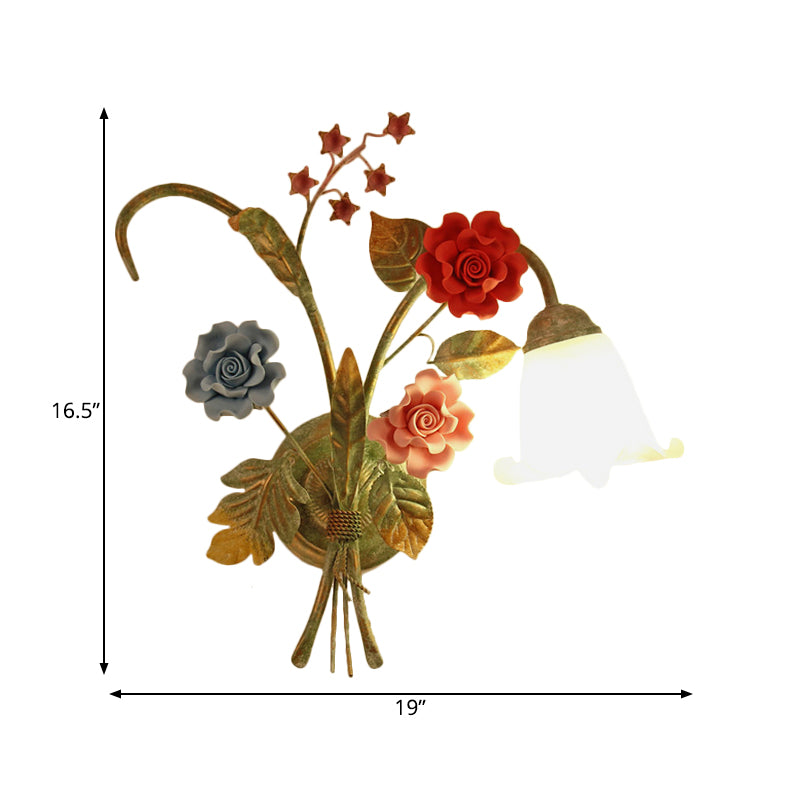 Green Glass Flower Wall Sconce With Curved Arm - Korean Garden Lamp