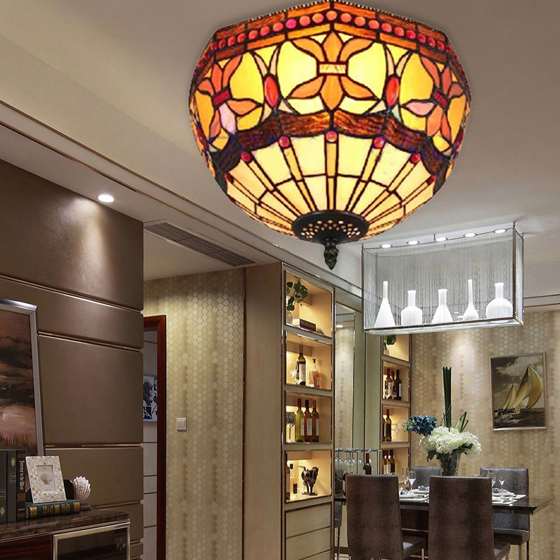 Vintage Industrial Stained Glass Flush Mount Ceiling Lights With 2 Bulbs Yellow