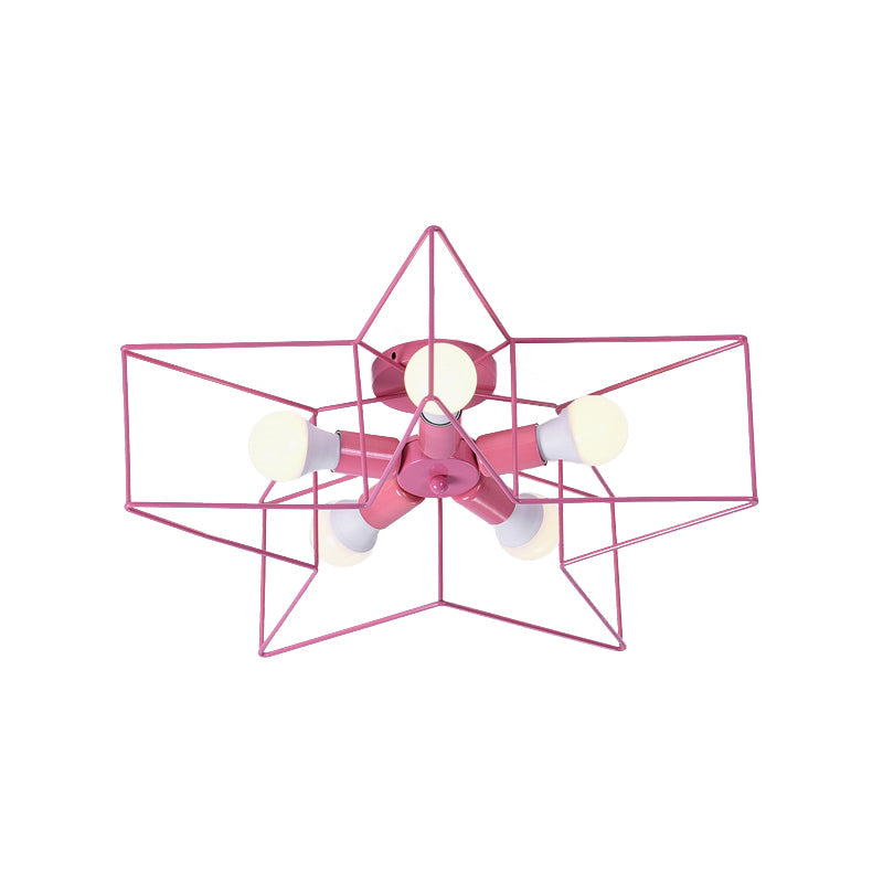 5-Light Industrial Ceiling Lamp For Kids Bedroom With Star Cage Design Pink