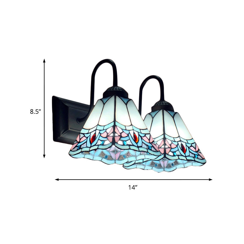 2-Head Pyramid Stained Glass Sconce Light With Tiffany Style - Black/Brass/Bronze Wall Mount Fixture
